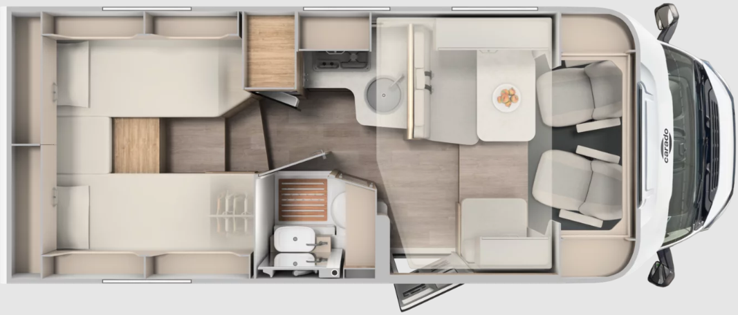 | Пол в кабине «Casual Suite» с боковым окном справа, соплами горячего воздуха, высотой 72 см и размером кровати 210 x 160 см |